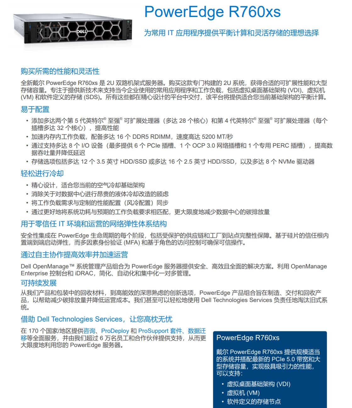 全新戴爾 PowerEdge R760xs 是 2U 雙路機架式服務器,專注于提供新技術來支持當今企業(yè)使用的常用應用程序和工作負載,包括虛擬桌面基礎架構 (VDI)、虛擬機(VM)和軟件定義的存儲 (SDS)。所有這些都在精心設計的平臺中交付,該平臺將提供適合您當前基礎架構的平衡計算