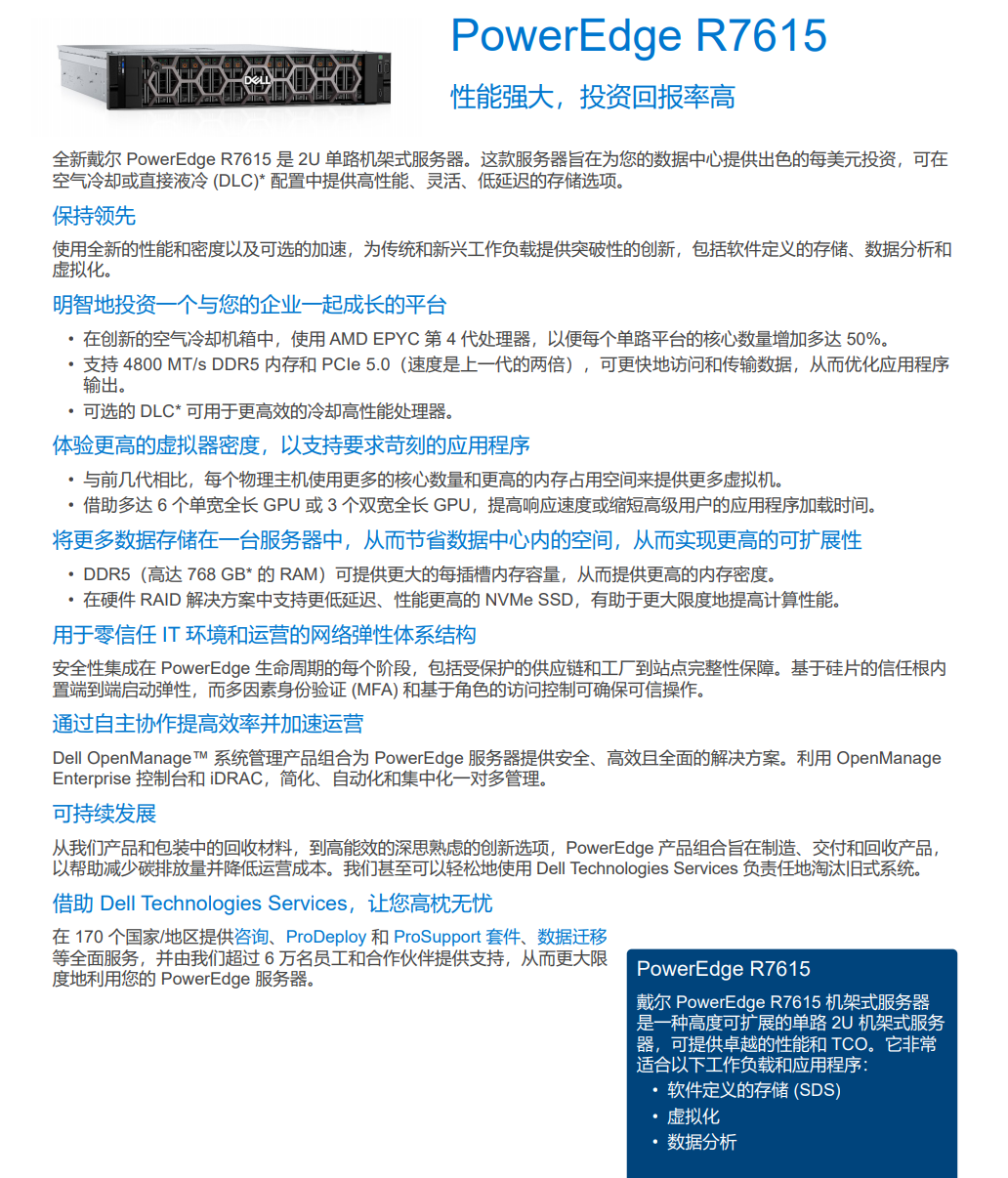 全新戴爾 PowerEdge R7615 是 2U 單路機(jī)架式服務(wù)器。這款服務(wù)器旨在為您的數(shù)據(jù)中心提供出色的每美元投資,可在空氣冷卻或直接液冷 (DLC)* 配置中提供高性能、靈活、低延遲的存儲選項。
