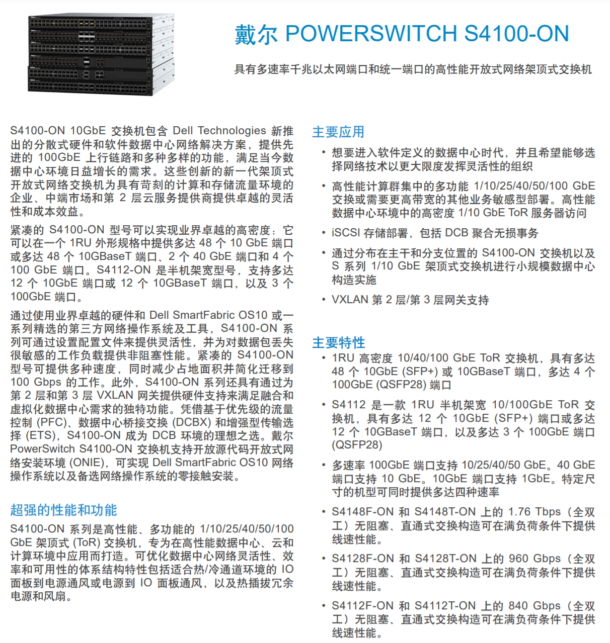 DELL POWERSWITCH S4100-ON具有多速率千兆以太網(wǎng)端口和統(tǒng)一端口的高性能開放式網(wǎng)絡(luò)架頂式交換機(jī)。
